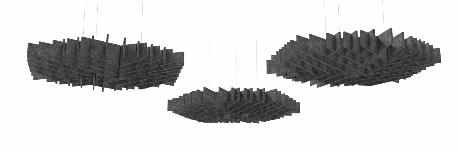 Drake comes at you from all angles. The geometry and linear blades curve to create a fun and beautiful high end acoustic cloud. Three sections create the Drake and make it whole. This cloud will bring designer lines and acoustic performance to your room!